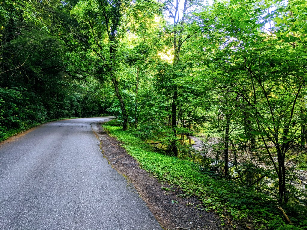 Walks have become my morning jolt of choice. Even when I may not want to, the dog motivates me to seek out cures for nature deficit disorder. In my new neighborhood, I’ve found more areas of the creek and a tiny, one lane road. It’s heavily treed and only a very occasional car comes through.