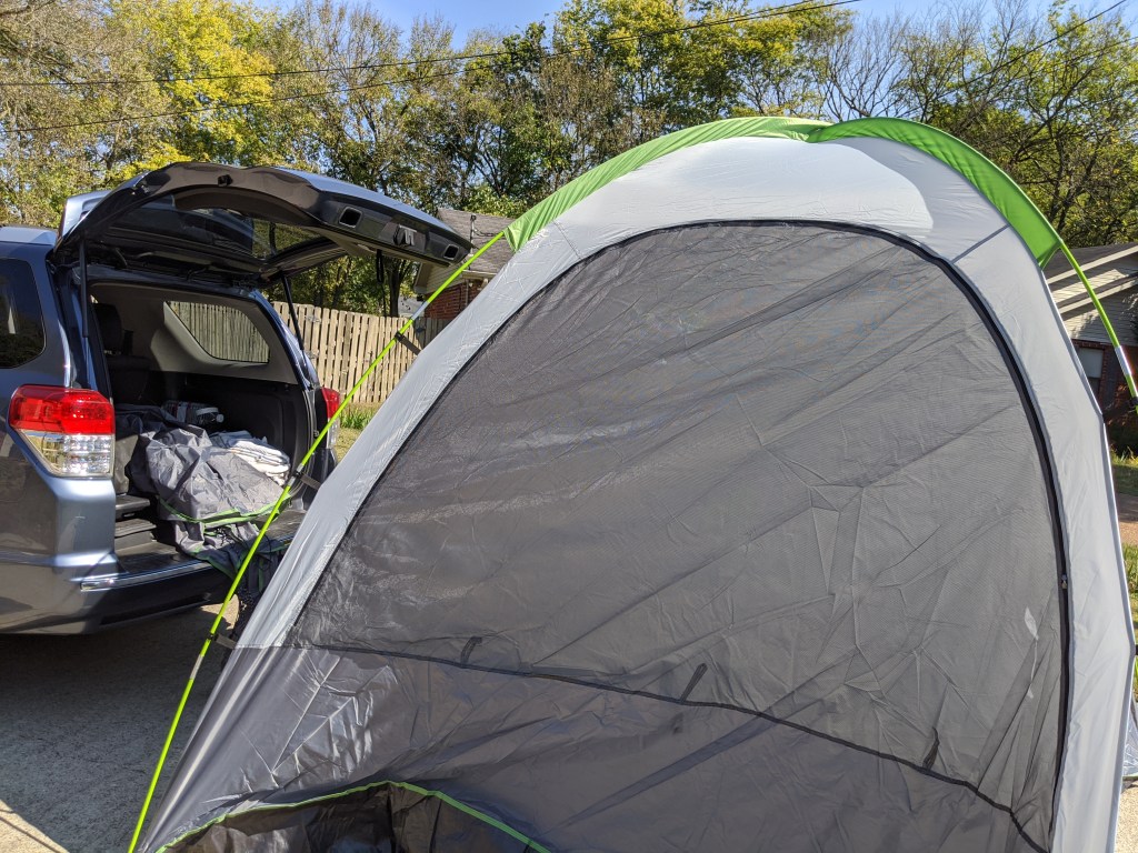 There wasn’t enough time to go on a proper forest hike, but I did the next best thing. Tested new gear! A quick driveway install of my new SUV tent from Out and About Green! It comes in a pretty compact tote bag, securely packed with carboard.