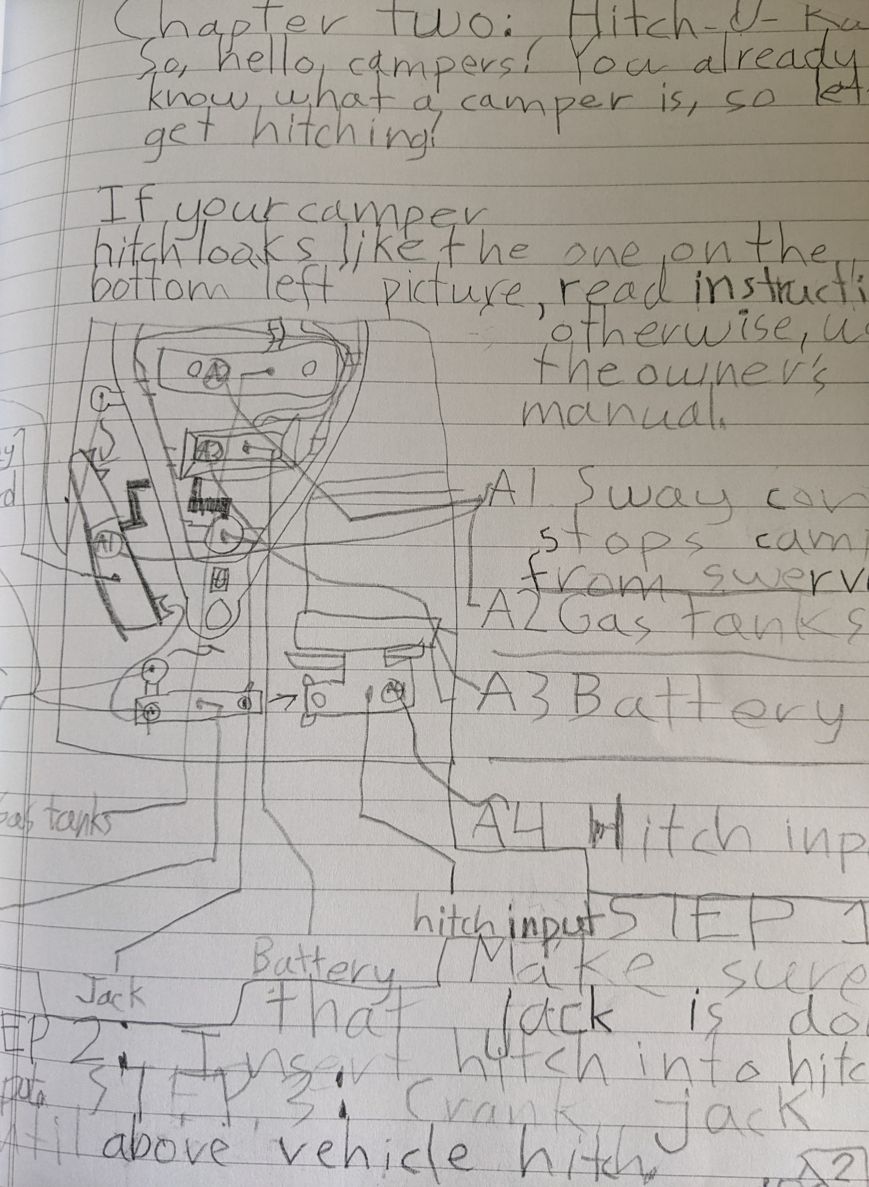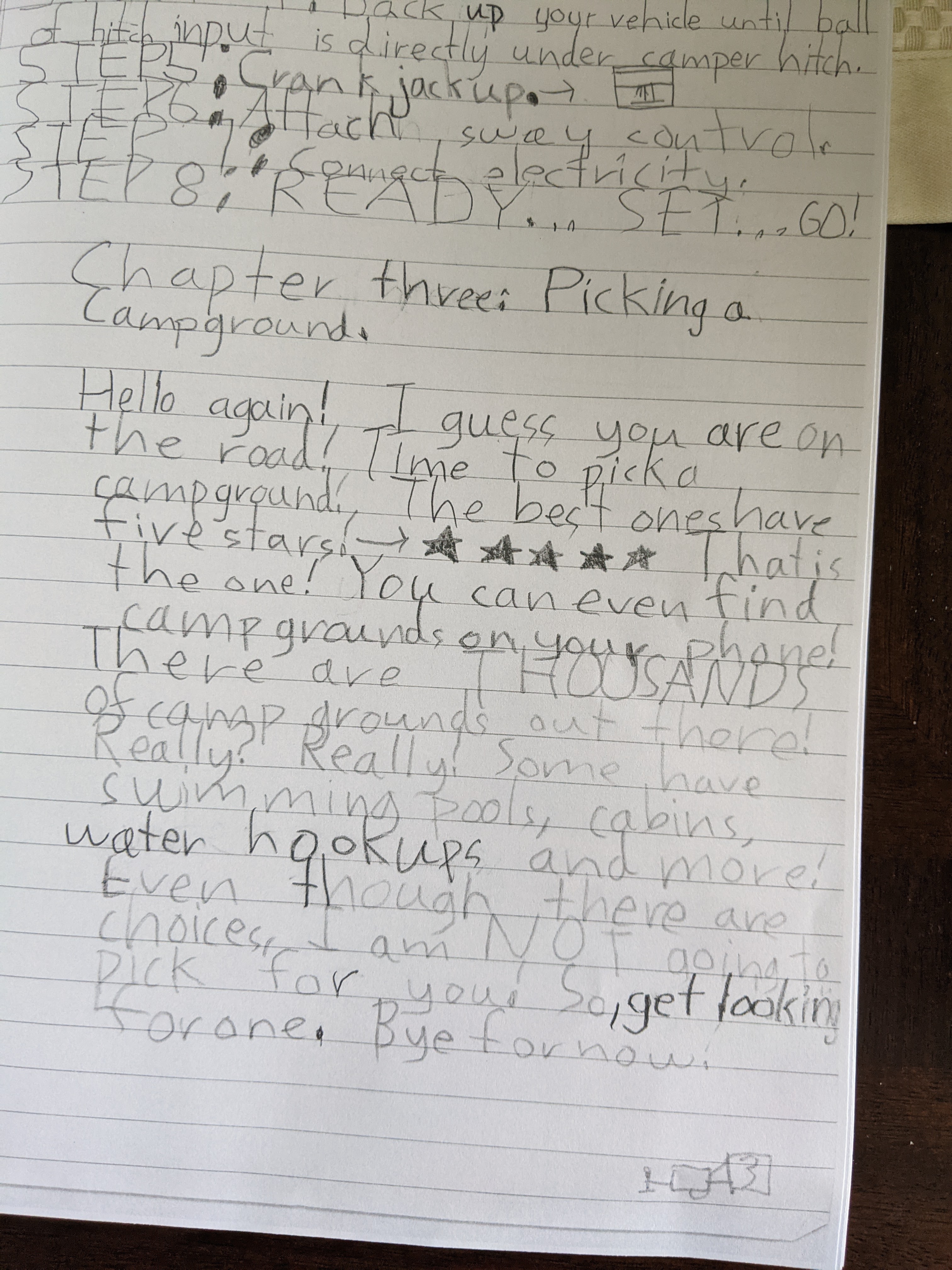 This is the most hilarious and coincidental timing. These pictures show part of a ‘book’ her eight-year old nephew made. It’s adorable. There’s this great blue and green Jayco on the cover, but also his name so I didn’t grab that photo. But it’s [his] Camping Adventure Guideline and It. Is. Everything.